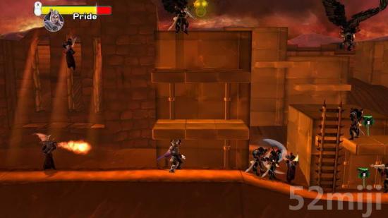 本关的最后一个场景是纯战斗场景。当然这里也是让玩家练习一下具体各类敌人的战斗策略。飞行类敌人可以使用GREED挂钩将其勾下,而其余的普通敌人则建议使用PRIDE来硬砍