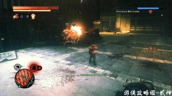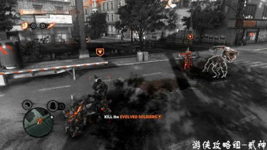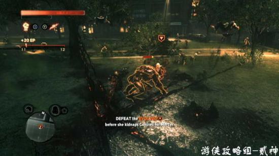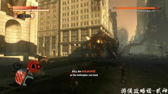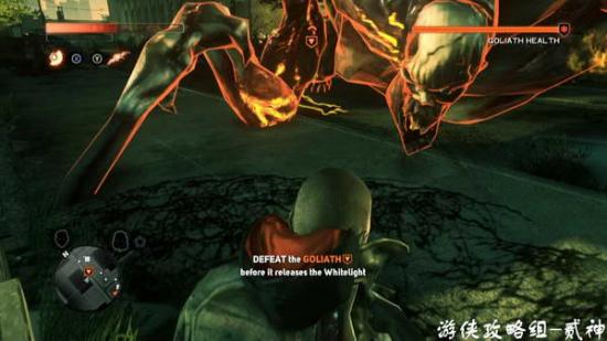 消灭几个被感染的士兵,顺便使用下召唤技能,场面很壮观-出现goliath 巨兽,不要上去硬拼,躲避它的一切攻击,注意视角向后调,未攻击到会出现硬直,逐个击破腿、手和头部,只要躲避好完全可以无伤