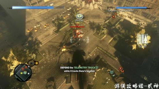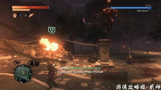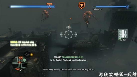 吸收驾驶员上直升机-练习操作直升机-保护目标,消灭周围敌人,注意直升机锁定用机枪和导弹一起攻击,触手怪会投掷物体,看屏幕提示按键发射导弹防御,操作不适应多尝试几次就好-出现goliath 巨兽动画后,下降到目标地营救