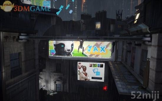 站到平台边缘,由红色的管子爬到右边阳台上拾取记忆包(1/3)。返回平台,翻越左边的广告牌,再沿一道灰色竖梁爬到贾克斯熊猫的广告牌,落身到平台上,在熊猫广告牌的后面找到记忆虫子(4/10)。