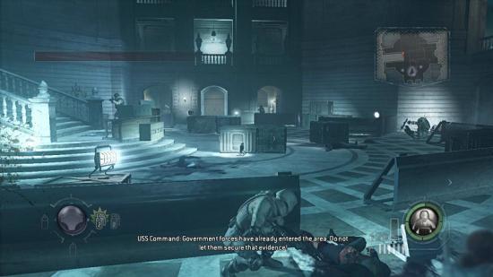 进入城市大厅,先借助掩体消灭中央的美国政府部队,防止他们收集证据,这里可以多扔几颗手雷炸飞这些家伙