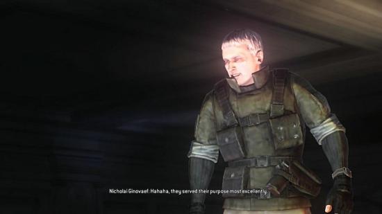 来个场景可见到本作品我们的第一号BOSS级别敌人Nicholai Ginovaef,冷血无情的佣兵队长,一阵寒暄继续前进