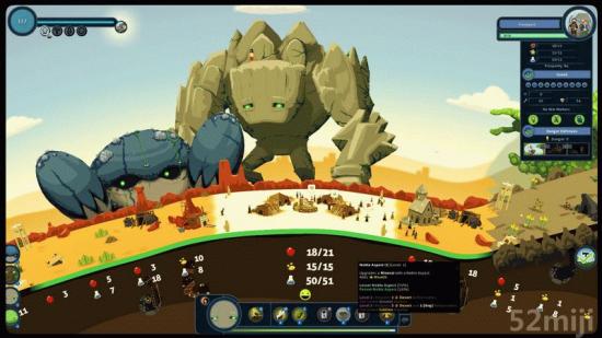 人类定居之后,玩家能够点选任何一格,在左上角可以查看其属性。最上方的表格就是三个资源的获得值,前面的是当前拥有量,后面的则是城市扩展所需要的数目,当三个数目全部达到后,城市的边界就向左右分别伸展一格。