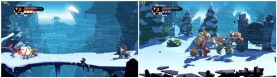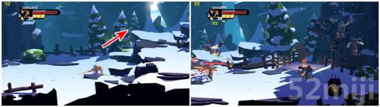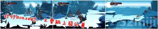 战斗分析:step1,穿过山洞,对战Bonze时从骑行兽上下来,因为Bonze一吓就可以把英雄打飞,吃力不讨好。先用骑行兽踩扁其他杂兵,面对Bonze就使用翻滚+远程攻击。还有杂兵的话继续用骑行兽踩扁;step2,前方有嗰台阶,骑行兽就不能上去了,所以就弃骑行兽,穿过山洞;step3,在冰桥上对付红色穿山甲即可。