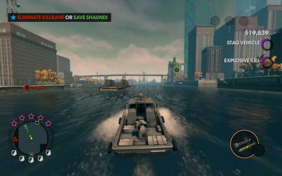 后面会出现抉择.是去杀死绿衣的BOSS还是放过他去救自己人,(本人是选择了救自己人所以下面以这条路线为主)开始去目标点的时候可找海上载具.在附近的港湾应该会有一艘警艇配备火箭弹和后座机炮,到达目标点后过场完后,继续开着我们的警艇前往