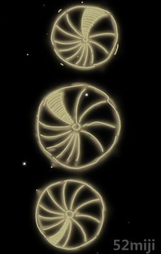 往西走,乘坐缆车来到一处池塘。用喇叭听池塘右边的植物,浮现3个圆盘,点击植物查看发现植物身上也有3个圆盘,而且圆盘中心有尖牙一样的指针。你需要做的就是将指针调至与刚才那幅图中实心瓣(图1)一样的位置。控制这3个指针的正是池塘里3支芦苇上可上下移动的3个豆荚。3个豆荚也代表3个池塘左边正在酣睡的两栖动物动物,豆荚不同的段位代表动物不同的节奏。做之前,先点击以叫醒它们。