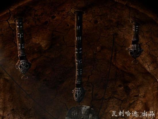 左右来回拽图腾,让它倒向洞口成为梯子。洞里倒悬3根图腾,调成如图5模样,墙上的木轮转动。点击左边墙缝里一眨一眨的眼睛,出来一条蜈蚣,点击蜈蚣可得到符号。回到地面3根图腾处,发现升降梯上来了,乘它下地底。