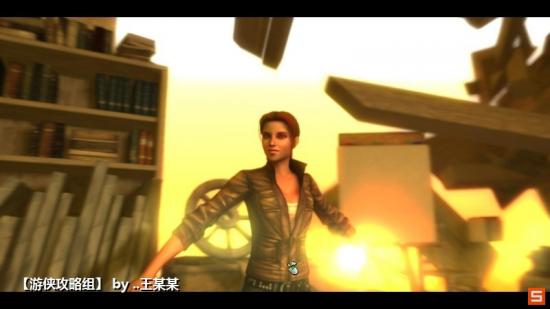 来到外面利用网挂门左侧的挂钩上,爬上去用剑砍断晾衣绳。