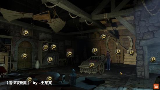 找到5样就行,其他不用管,把拐杖和颜料罐合并,在木车和书架的中间有一个帆布,利用有红色颜料的拐杖点击它会得到一个密码(达芬奇密码?)