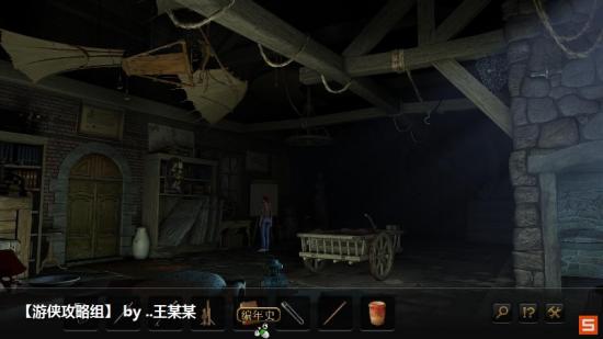 接着利用打火机点燃木车上面的油灯,利用千斤顶顶起小车,后面的墙上拿到三把楔子。