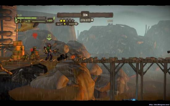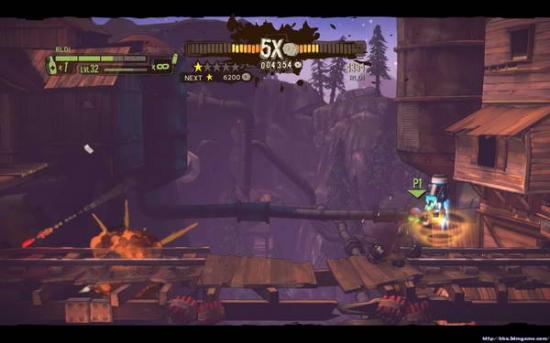 到了桥上会到第四个遇敌点会出现两个榴弹机器人和一定数量的飞行机器人等全数击杀后从矿车跳到上方继续前进.解决掉路上的自走炮台和飞行机器人后来到森林入口会到第五个遇敌点会出现一定数量的飞行机器人和两个榴弹机器人等,前进一段距离后会到第六个遇敌点会出现一个自走机枪和飞行机器人等杂兵.边走边清理杂兵到下个补给点后前方就是BOSS战