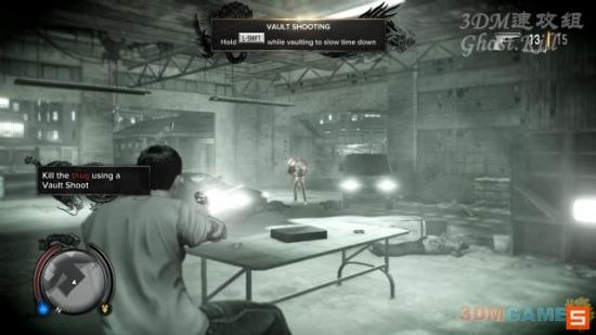 赢得比赛后去夜店找上次一起唱歌的妹子,从她那里拿到一把枪,带着枪去见上司,要开始练习枪的使用了,当然只是模拟实战,所以不会受伤。按shift键瞄准,左键射击,按照提示射击红色物体,然后到障碍物后找掩体,只按左键进行一阵盲射。最后按空格翻越障碍时按shift瞄准可以进入子弹时间,干掉剩下的敌人。最后一个敌人打不死,他会上传准备逃走,打爆轮胎完成任务。