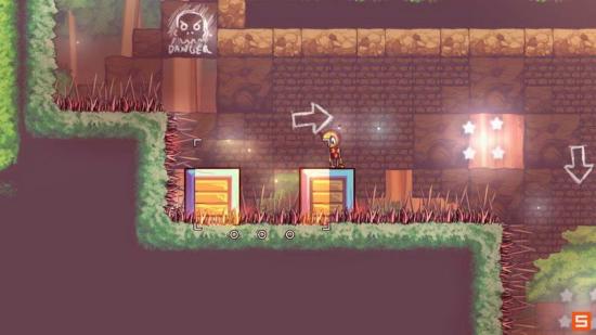 第二关也很简单。对于长距离的尖刺。,玩家首先可以利用两个木箱的交互移动从而越过障碍