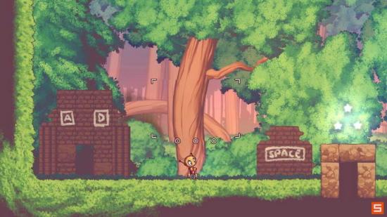 注意第一关的斜平面放置弹簧草的方法。这个技巧很重要,后面的很多场景都需要斜放置弹簧草从而让机器人快速飞跃极长的障碍(远比竖直跳跃高许多,因为重力的束缚斜跳比直跳要小)