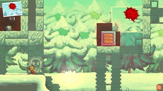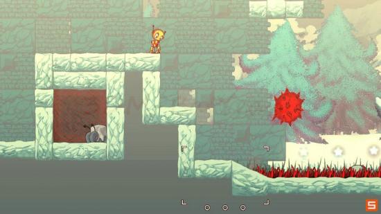 二三关都是很难的。这一关首先将爬墙蟹移动到右边的墙壁,然后从中间的雪球高台跳跃到爬墙蟹上到达终点。由于最后落点很低,所以很容易被尖刺杀死要多实验几次