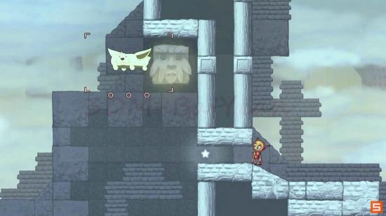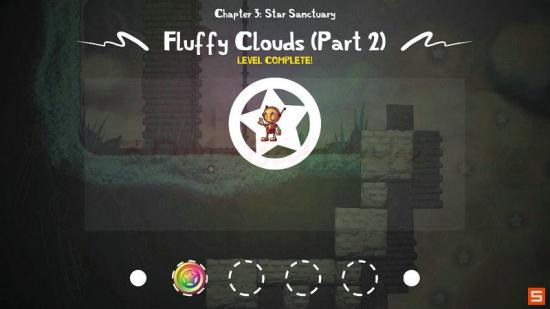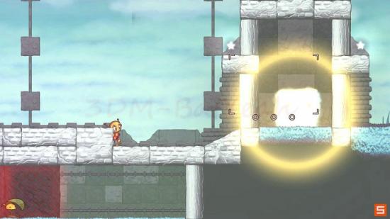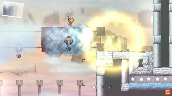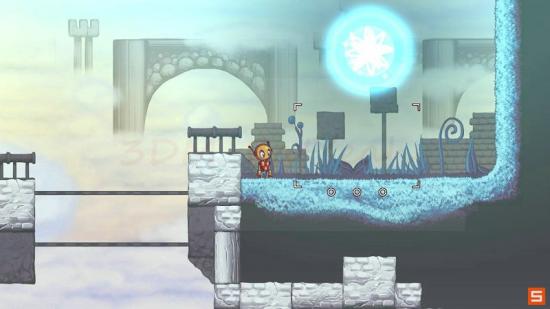 这一关需要玩家分别去两边保存好初始的虚拟云彩,然后逐步放置到中间的机关从而让下面的障碍彻底拉开,玩家趁此拍下弹簧草从而跳到上层完成本关