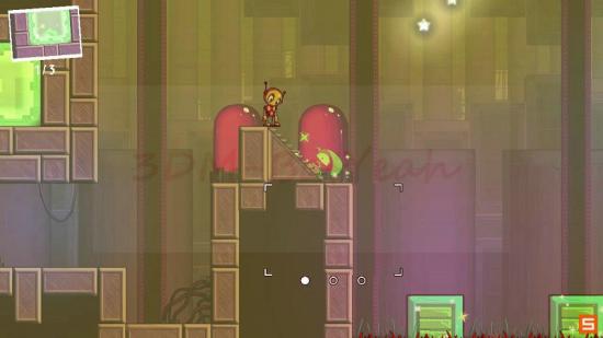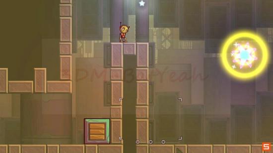 相当有难度的关卡。箱子和弹簧草都要复制;然后斜放一个弹簧草;其余的道具要全部保存携带(非常重要);然后来到两个高台的中间,将两个箱子叠罗汉在将弹簧草放置到最高点即可跳跃到出口