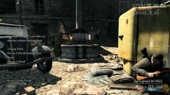 第一次的狙击,不需要考虑风向风速,只需要考虑重力问题,调整好之后射杀右边的敌人,然后从身后的门离开,也可以留下来干掉剩下的敌人。出门后楼下有两个敌人,其中一个踩到刚才埋得地雷,另一个射杀。