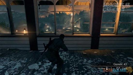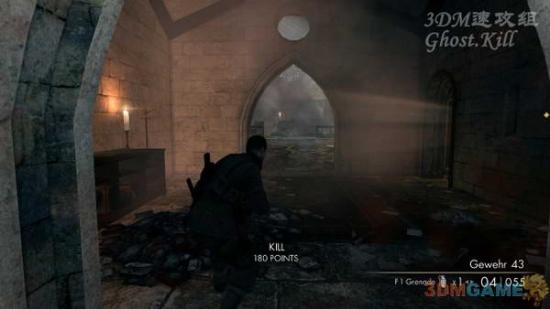 来到战壕后一直跑步向着下一个目标点前进就可以了,不要担心被发现什么的,第二个需要爬着进入的地方用消音手枪干掉里边的敌人,然后厨房间出去一路跑着上山,路上还会遇到一个敌人,直接狙死。上山后找掩体,干掉教堂窗口那里的狙击手。