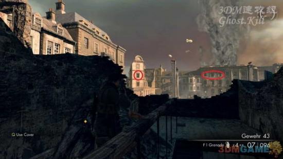 来到街道上利用炮声的掩护干掉图中标示的狙击手,这附近剩下的敌人同样解决掉,然后进入刚才狙击手所在建筑,一层门口的暗杀掉,二层的敌人消音手枪解决,从墙壁破口出去,沿掩体进入目标建筑。