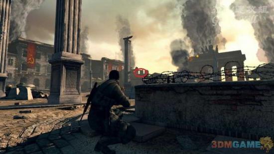 除了狙击手以外就是杂兵了,数量多点但问题不大,杀光之后爬上挂着苏军旗子的大门,没时间调整呼吸了,目标正在开车逃走,完全看手感了,干掉之后通关。