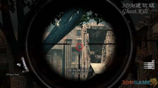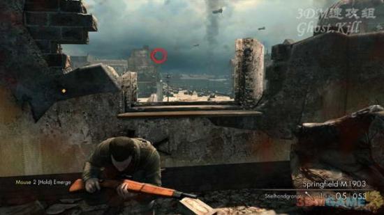 机枪手和杂兵都干掉后从废墟出来,狙杀这个位置的狙击手,继续前进,剩下的两个狙击手的位置如下图所示,全部干掉后到目标点过关。