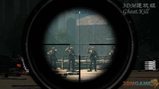 这关敌人狙击手很多,我会在图中一一标出来。开始后先解决上图的两个狙击手,然后杀光广场上的杂兵,进入建筑内部,干掉几个敌人后来到目标的二层楼,拿到新的狙击枪,然后下楼来到街道上。
