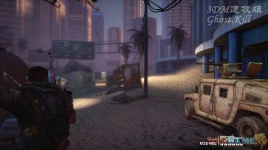 乘卡车沿路前进,使用榴弹发射器干掉路上的敌人,弹药无限所以无需节省。除了敌人还有悍马车