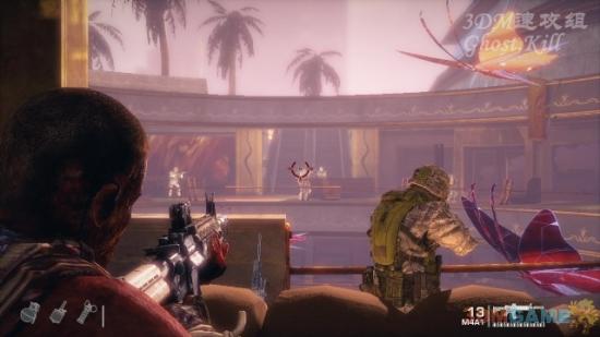 爆炒楼上的机枪手,杀光敌人后使用机枪掩护队友,敌人会各个方向都会过来,只要小心别让机枪过热就没什么问题。最后两个队友乘滑索过来汇合,过关。