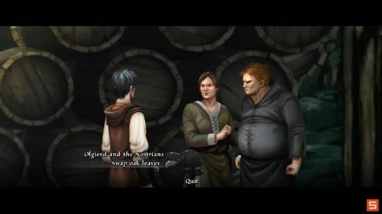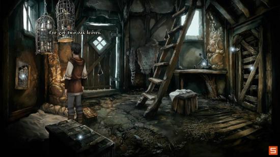 从小屋出来同OLEIGRD对话,他们肯定是不会把GERON当回事交还第三个OAR LEAF的。进入该场景右边小屋来到楼上,探听到楼下OLEIGRD和他的仆人之间的对话;得知一个OAR LEAF藏在守卫的衣服里面。