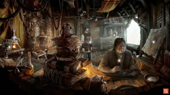 孱弱的GERON自然不是两个大汉的对手,GERON企图拿一旁的锤头攻击NOSTRAINS也无济于事,情急之下GERON使出了突然使用魔法摧毁了旁边的一个水瓶,两人惊吓赶紧扔下了GERON。