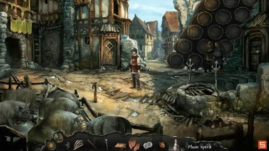 这里要选择PLUM SPIRIT,然后前往小屋的猪圈水槽将其放入迷倒全部的猪;从水槽里面取得最后一个OAR LEAF