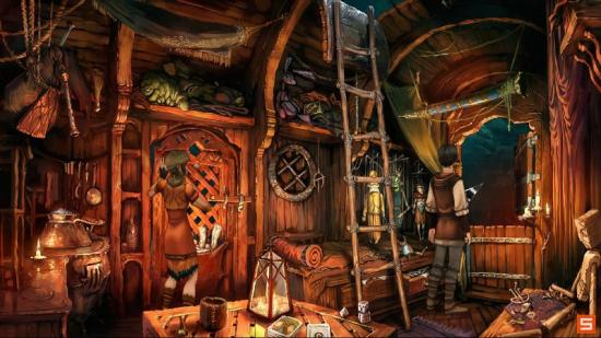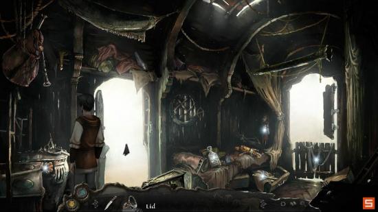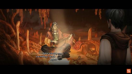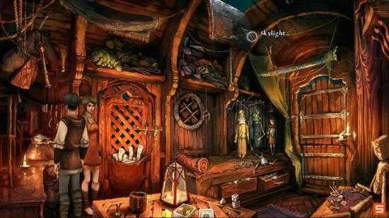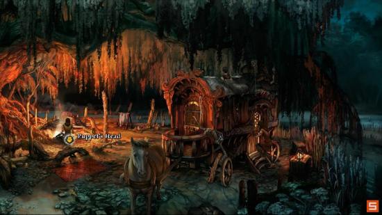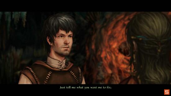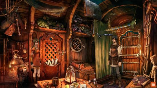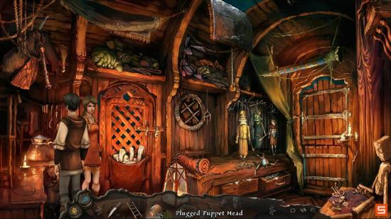 如果这里不知道如何推进剧情的话,可以同NURI对话然后点击鼠标右键可以自动出现将PUPPET扔到火堆的提示(游戏后面的很多场景都可以利用鼠标右键点击物品或者场景得到提示)