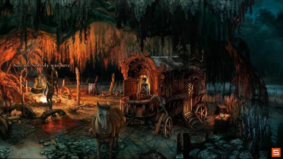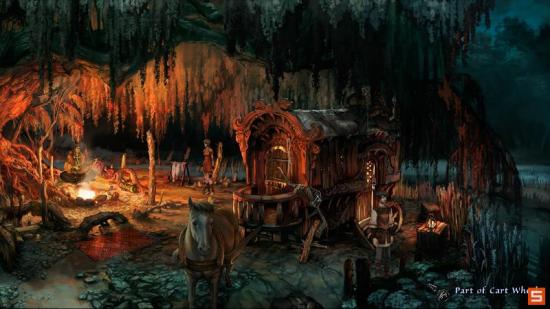 车轮一共有三个部件,前面两个很好找,在车轮损坏的附近就可以取得。第三个在右边草丛里面隐藏,需要鼠标不断的点击调查才能发现。收集齐全所有的车轮随便使用修复魔法修复装上即可得到马车的瑶池。然后GARON和NURI先进入马车的房间,ISADA则表示先在外面等待一段时间再出发