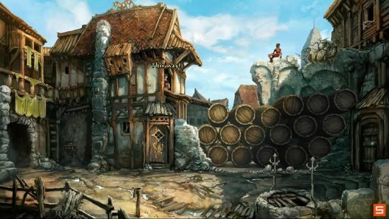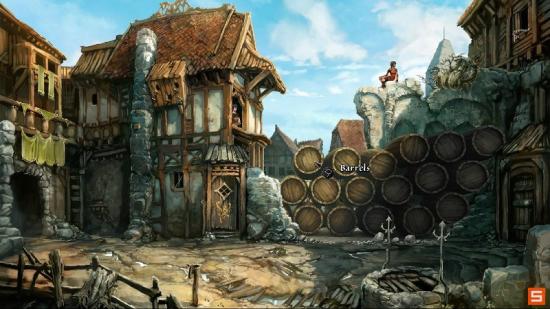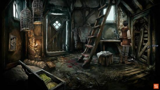 然后拿锤子砸坏一层小隔间门的铁栅,取得木门;从二层的窗户放置在木桶上面让NURI沿着其下来;最终两人一起逃出了城堡