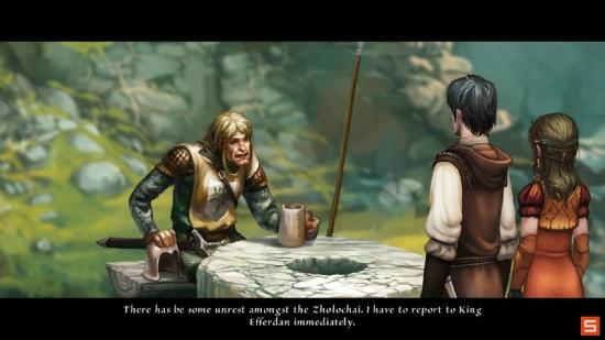 两人同小站的骑士对话,得知这位名叫HAIL RONDRA的骑士居然是前往兽人营地探听动乱情报的斥候,而且刚从RED LAKE附近的ZHOLOCHAI营地归来