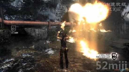 用滑索回到地面,下楼梯后有个油罐,用撬斧拧开闸门放油,然后进入旁边的房间,从桌子上可以拿到新道具,这样可以按住X自己生火了。点燃地上的油引爆油罐,之后救援赶来,却被闪电打了下来,之后你懂得,劳拉为了逃过坠机的各种动作场景,按好QTE就行。