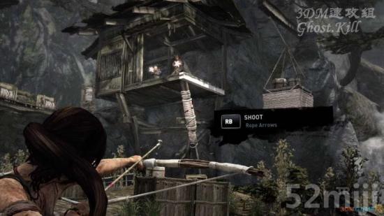 飞机的驾驶员成功逃离,追上去。经过图中的村子,弓箭得到升级,像这种绑着绳子的地方用弓箭瞄准后按RB可以射上去一只带绳子的箭,拉绳子可以把射中的目标拉过来,图中这种情况就是破坏掉敌人的落脚点,当然还有其他用途,下面会说。按LB同样会发黄光。杀光敌人后把那个吊着的方形平台拉过来跳上去可以离开这里。