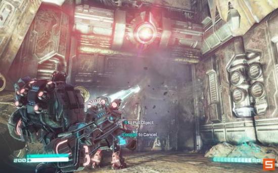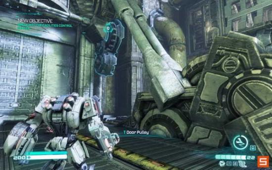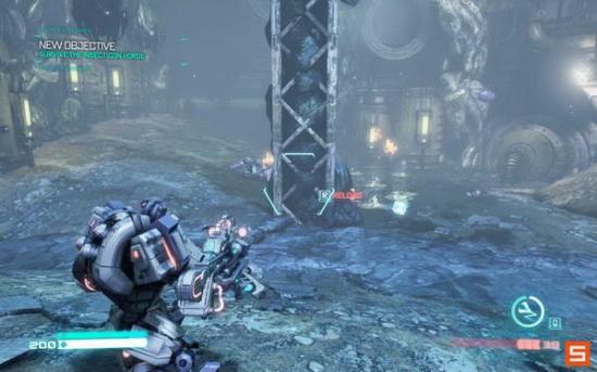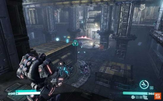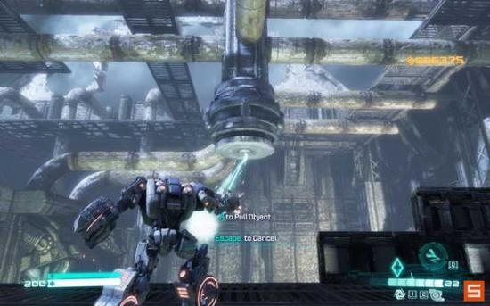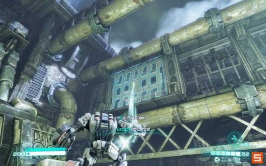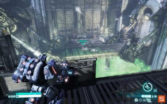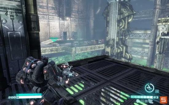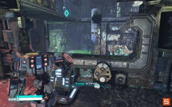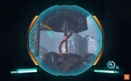 来到下图的废旧金刚场景。这里首先需要飞到高台按Q将锁死金刚的通道打开,然后绕到另一边使用狙击枪打断连接的铁链。注意该场景需要消灭所有的怪物之后才能推进剧情
