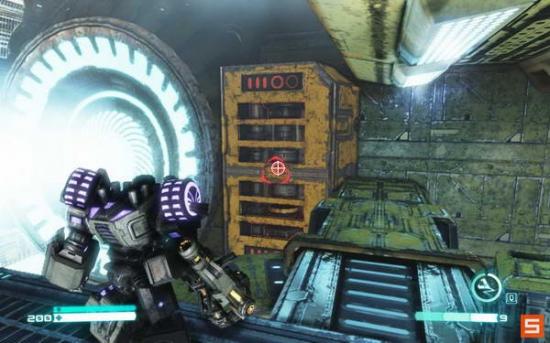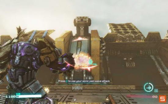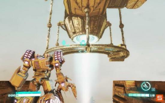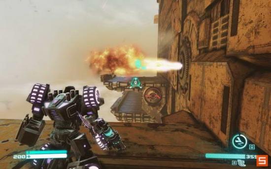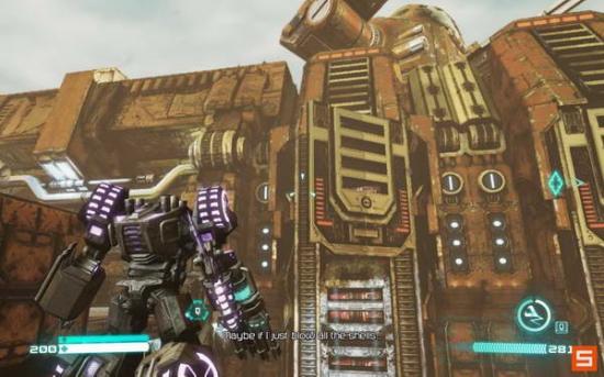 第二,来到对付第一巨型炮塔的位置。首先跳跃到对面悬空平台之上,然后按Q拉开炮塔的装弹箱,攻击暴露在外面的巨型炮弹从而摧毁炮台。这里要注意,所拉开的装弹箱是会自动回复关闭的,因而玩家一定要选择好站位在进行攻击