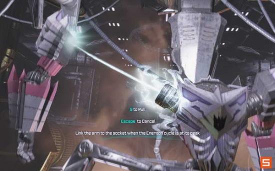 然后则是分别启动两边的装备系统,按S将威震天的两个双臂组合到他的身体之上。这里注意装备全程要持续白光,如果出现红光则说明装配失败,再来一次即可。玩家可通过鼠标移动来保证安全的白光
