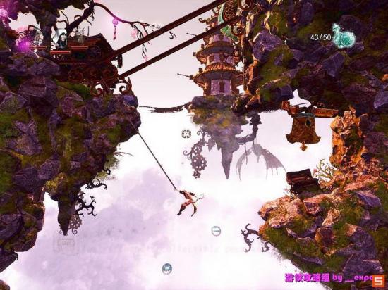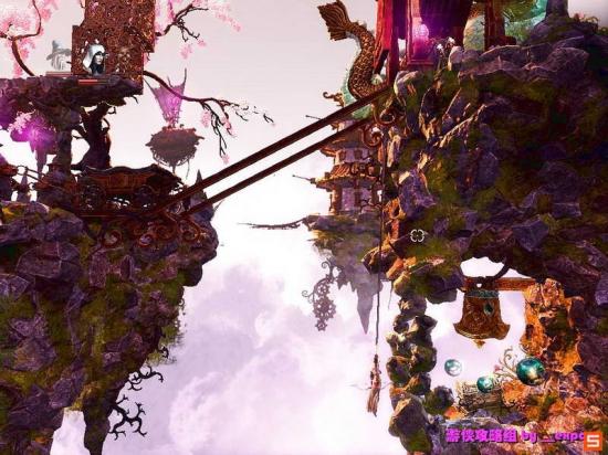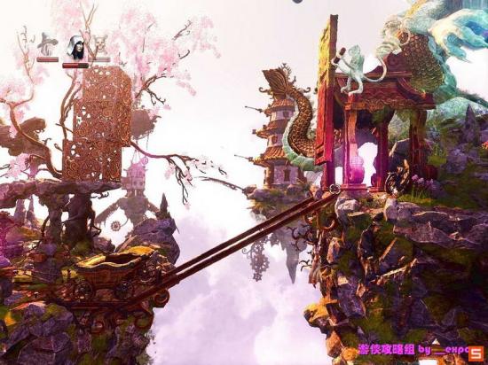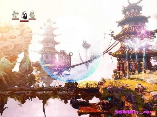 其实这里的道具非常好吃到,打到这里的时候笔者还没体会到游戏的精髓。其实简单的操作就是在两个会放电的平台上方各自摆放一根木板,然后魔法师站在木桩上,操作能飞的平台。魔法师的操作的基本原则是不能操作和自己接触的物体,但是中间隔了块木板,就可以直接操作平台让自己像乘着魔毯一样飞行了。