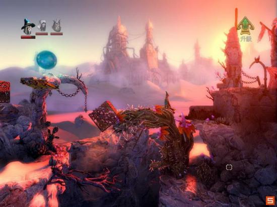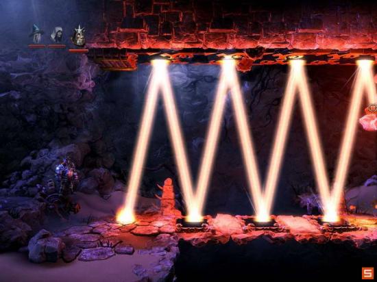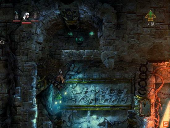 注意弓箭手脚下踩的地方有一个石像的头,它压住的是火焰的开关。利用魔法师将头移动到右边有圣水瓶的那个无头雕像上,雕像下降,再召唤一个箱子压住本来头像压住的开关,过去,取得圣水瓶和药水,另外别急着走,箱子里有“谜之碎片”
