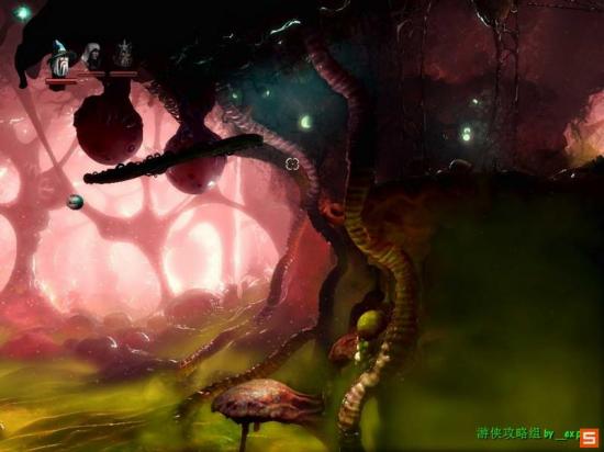 小心图中的这种虫子,它的攻击判定是左边的触手,被抓到会直接被吃掉,可以用箱子和场景道具欺骗它,吞噬的时候会有一定时间攻击硬直。