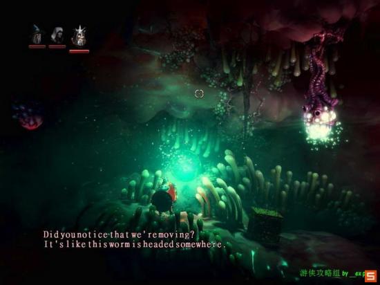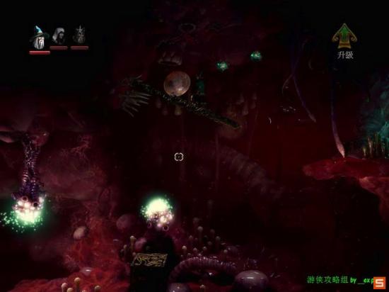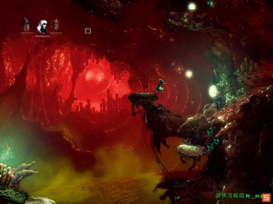 这一关十分容易让人反胃,将沙虫猎奇的内脏结构毫无保留的展现在玩家面前,体内到处喷射的酸碱都会造成伤害而对寻宝产生阻碍,看起来就一根肠子或者血管连着的器官有着充分的弹性无法用蛮力拉断。为何不直接在沙虫体内弄一番破坏却要想办法逃出去呢。关卡开始,注意图中的这种包状物体,对其攻击会产生短暂的收缩,并且通常会暂时露出一个隐藏的落脚点。在其收缩的时候可以将召唤物卡在它的根部,注意太长了会被它用蛮力挤上去。第一幕的前面几个药水瓶直接利用右边的弹性平台就可以吃到,这两个包的左边有四个药水和一个圣水瓶,建议等盗贼学会了“重力领域”的技能再来吃,笔者暂时没有发现此外的吃法。有“重力领域”的操作是用法师在半空制造出一个箱子,然后让其自由滑落,接着迅速切换到盗贼按下F键切换成重力箭进行射击。之后在那物个物体周围就形成了低重力区域,再用法师的召唤物进行违反牛顿运动规律的跳跃就可以吃到。