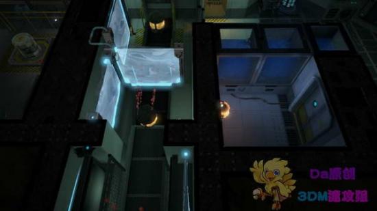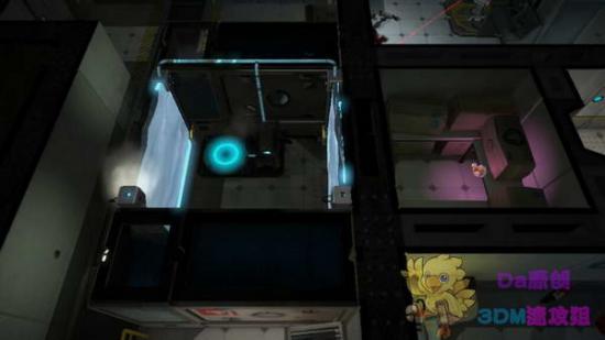 这里的运输带向下移动,所以按住上键在闪到右边的房间。不要被光幕碰着