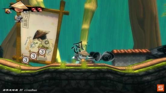 来到一块大型广告牌前面,提示你连续按攻击键可以出连击,大师的手真的很短,貌似是左右各一斧,然后原地旋转攻击。一开始遇到的小怪没有任何攻击动作,放心地连击吧。收集酒坛子数量,干掉小怪数量都是游戏过关的统计项目,至于快速通关,可以等二周目再挑战。走出一个牌坊,序章就这样结束了。