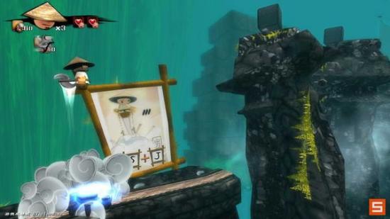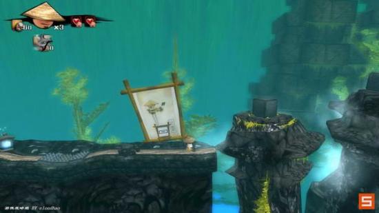 一直来到这个地方,面前的三个石块打不动,挡住了去路,一旁的牌子提示我们需要跳跃后向下攻击,这一招式非常实用,一个是可以让大师跳得更高,另一个是可以震碎石块。