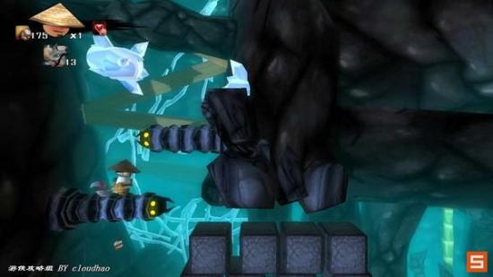 一路上干掉炸弹怪和锤子怪,然后来到滚石的场景,数一数有四个小石头滚过去,我们就可以前进。