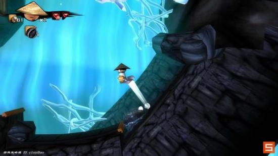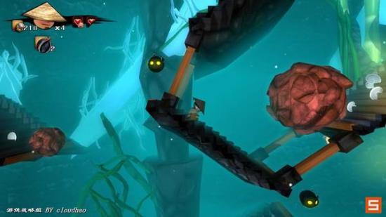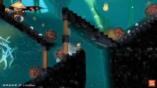 从有怪的地方往上跳,注意大石头是一击必杀,每次有三个,场景的左边也有些酒坛子需要手机。